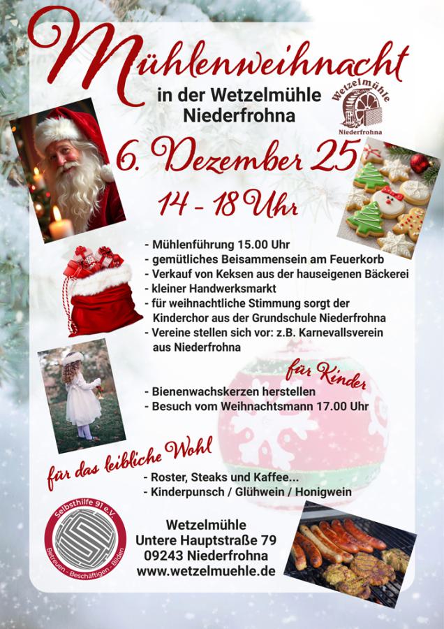 Auch in diesem Jahr möchten wir wieder zu unserer Mühlenweihnacht in die Wetzelmühle Niederfrohna einladen.